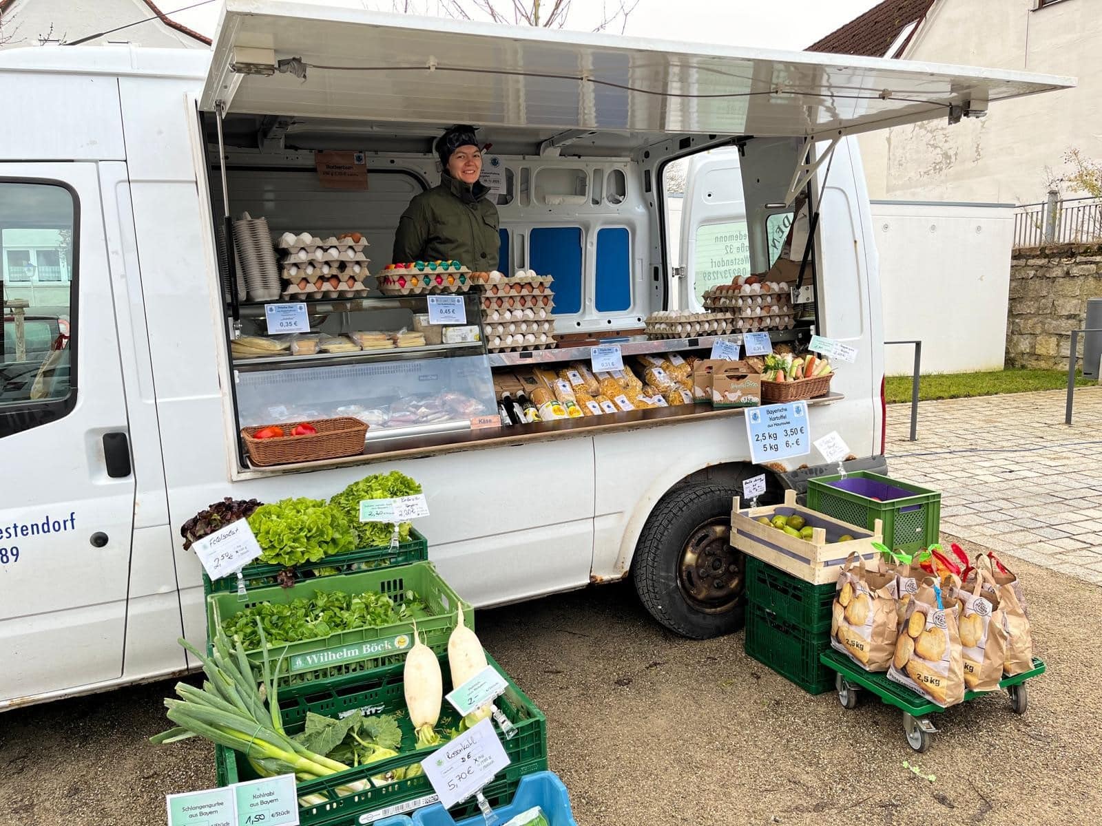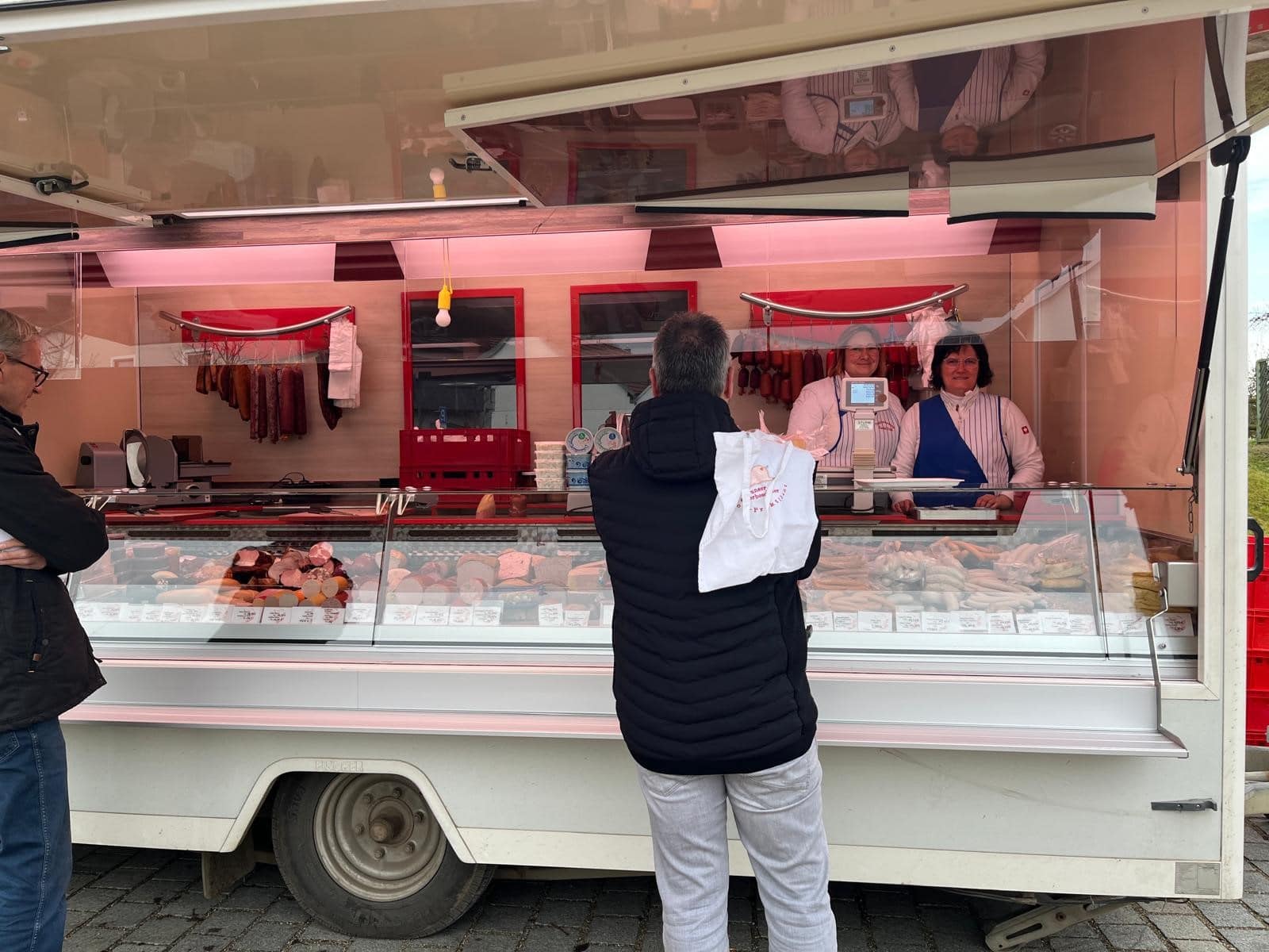 Verkauft wird hier Obst und Gemüse, sowie Geflügel, Käse und Eier der Familie Wiedemann. Die Metzgerei Frick hat ihren Stand mit verschiedensten Fleisch- und Wurstwaren.