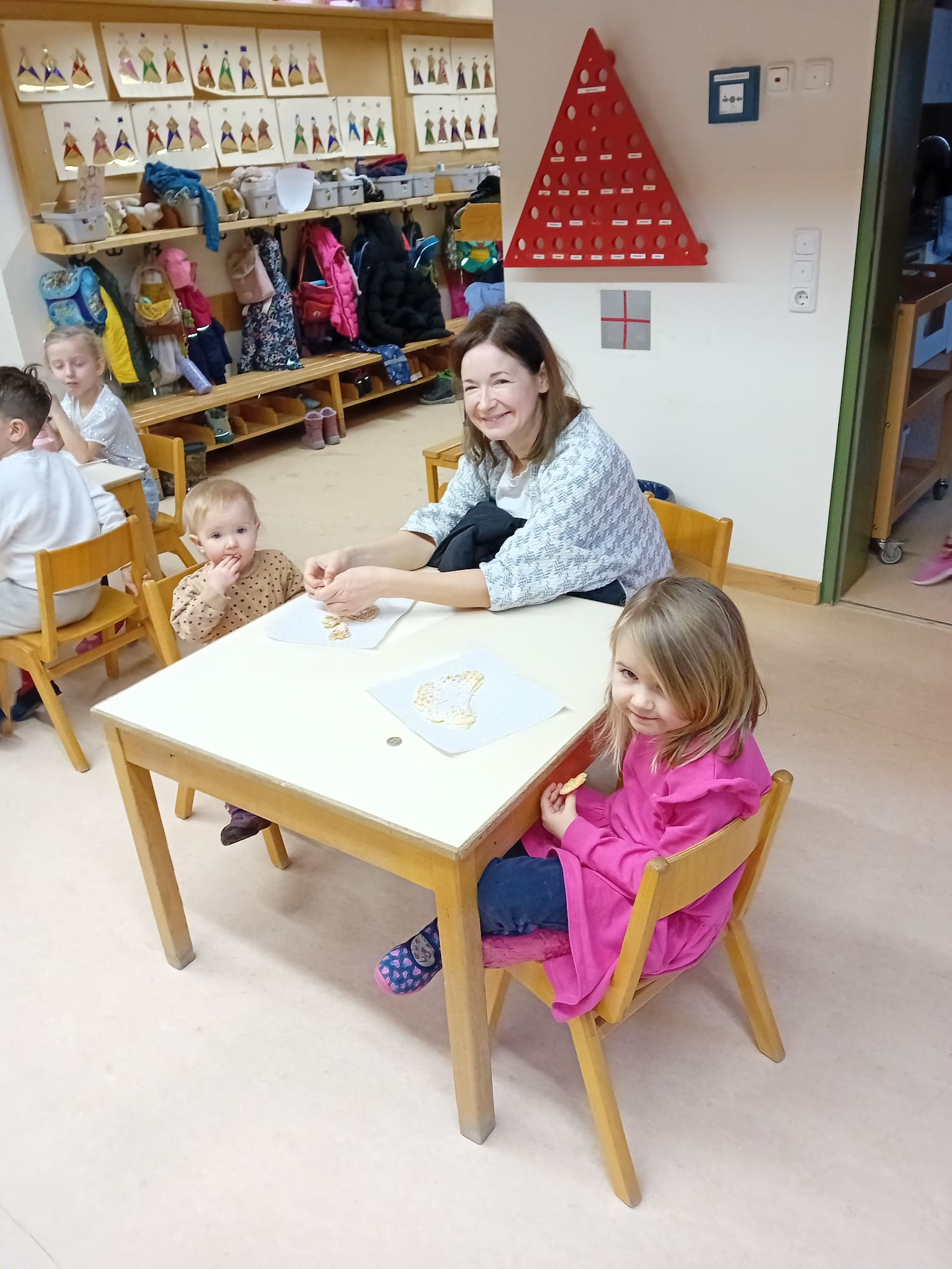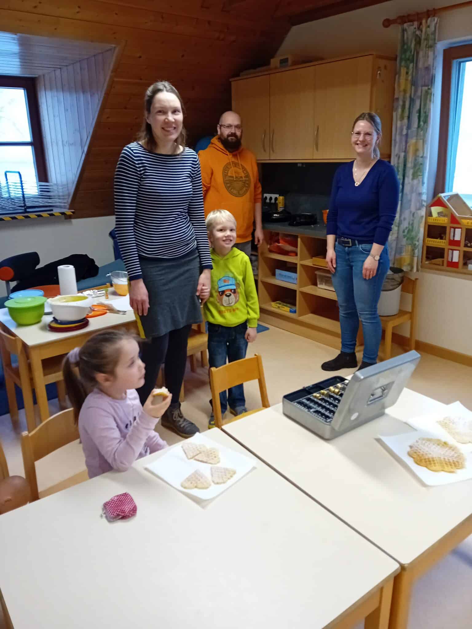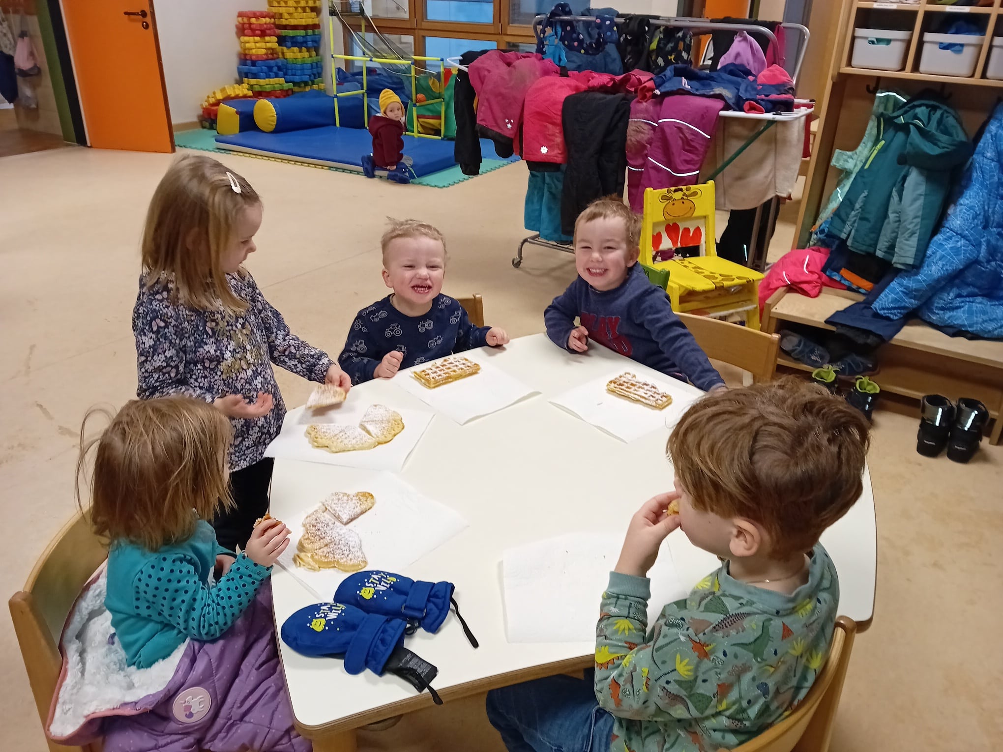 Am Freitag, den 21. 02.2025 zog schon morgens ein köstlicher Duft von frischgebackenen Waffeln durch das Haus. An drei Stationen wurden von den Eltern aus dem mitgebrachten Teig Waffeln gebacken und für 50 Cent pro Stück an Kinder und Eltern verkauft. Einige Eltern nahmen sich sogar Zeit, sich zusammen mit ihrem Kind gleich bei uns eine Waffel schmecken zu lassen. Unsere Spielgeldkasse konnte somit um 210 Euro aufgestockt werden. Wir bedanken uns herzlich beim Elternbeirat und allen helfenden Eltern und natürlich auch bei den Käuferinnen und Käufern für diese gelungene Aktion.