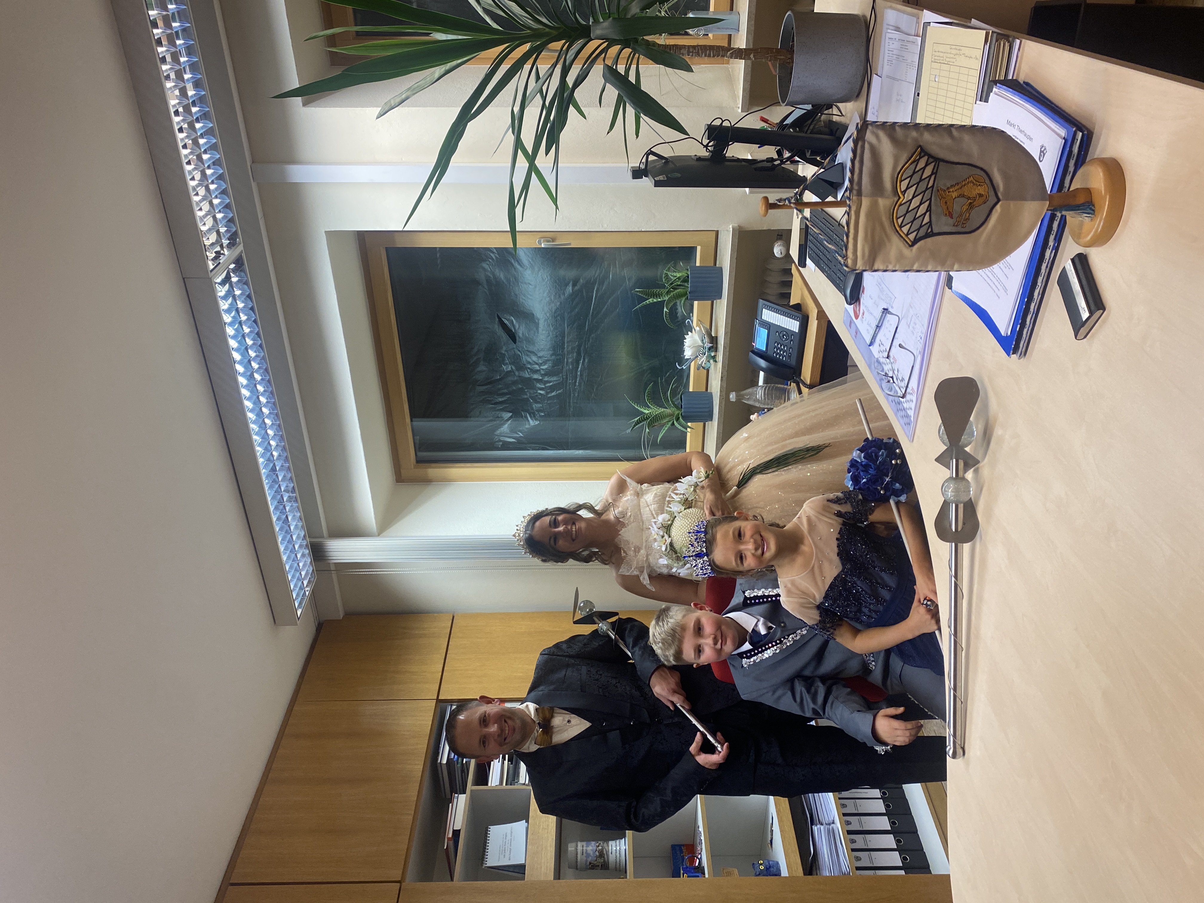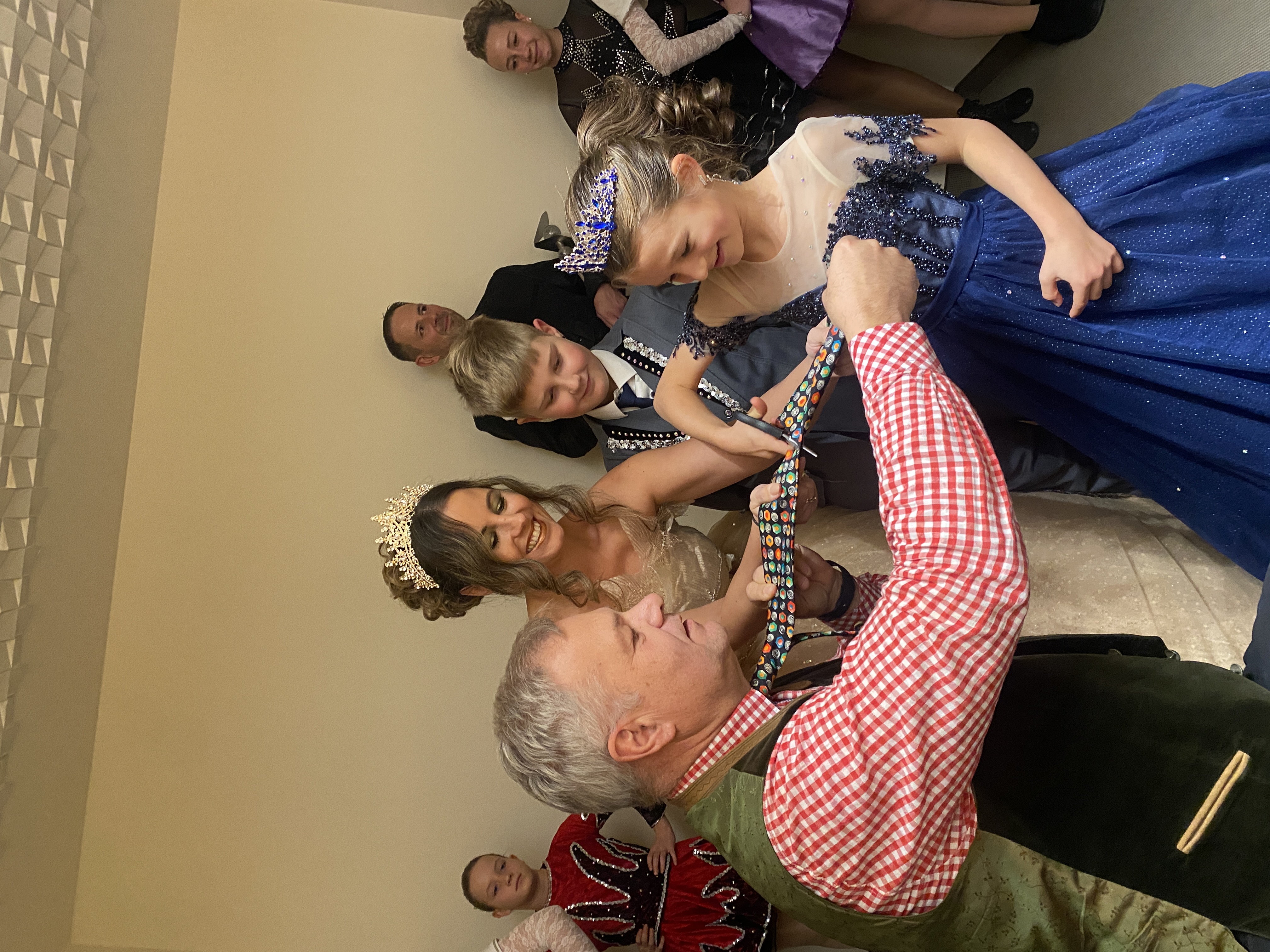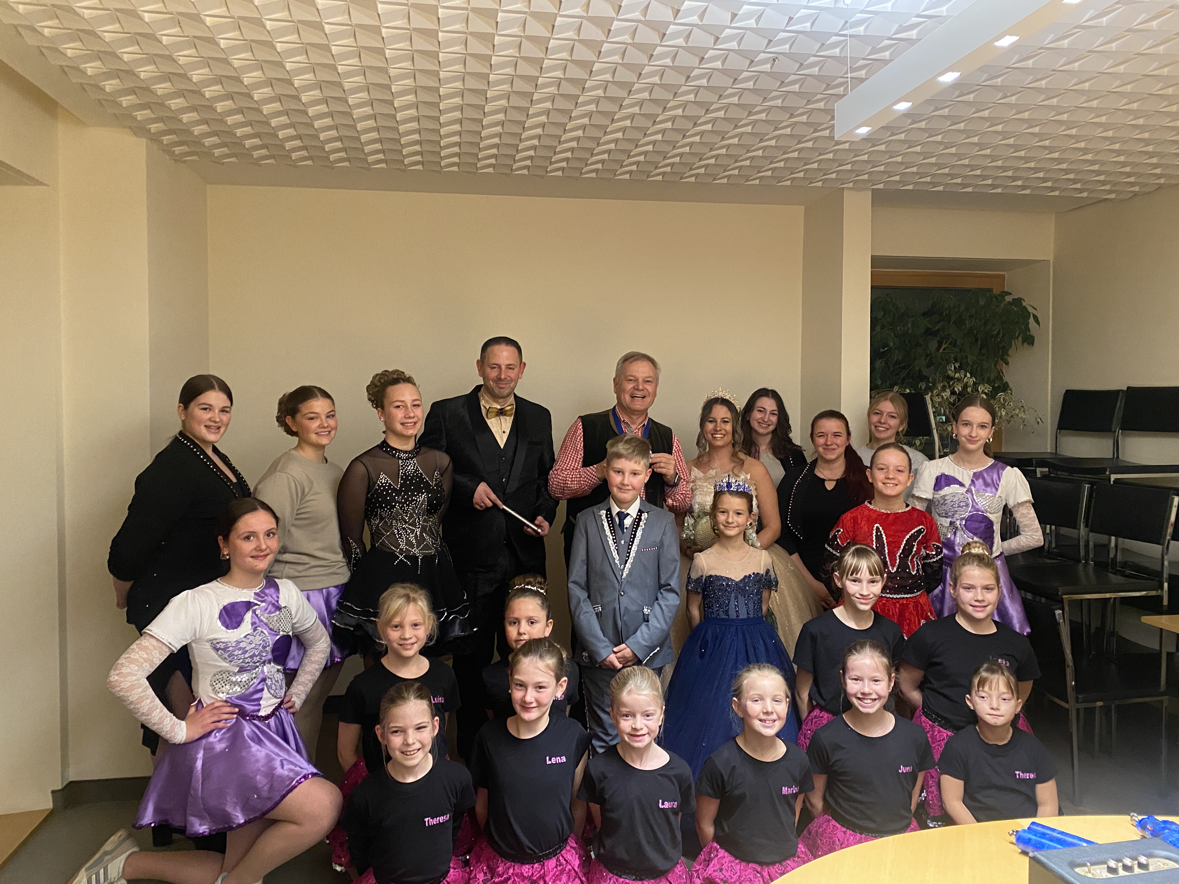 Nach einem tollen Einmarsch durch den Kinder- und Erwachsenenhofstaat, stellte sich das Kinderprinzenpaar Prinzessin Luisa I. mit ihrem Prinz Moritz II., sowie das Erwachsenenprinzenpaar Prinzessin Bianca I. mit ihrem Prinz Daniel I., dem Rathauspersonal vor. Mit dabei waren auch das Tanzmariechen Anna und das Funkenmariechen Emilia. Nachdem das Kinderprinzenpaar mit ihrem Prinzenwalzer die Mitarbeiter/innen des Rathauses überraschte, fand der Gemeinschaftstanz mit allen Tänzerinnen und Tänzern statt. Im Anschluss durften die Prinzessinen unserem ersten Bürgermeister Toni Brugger traditionell die Krawatte abschneiden.