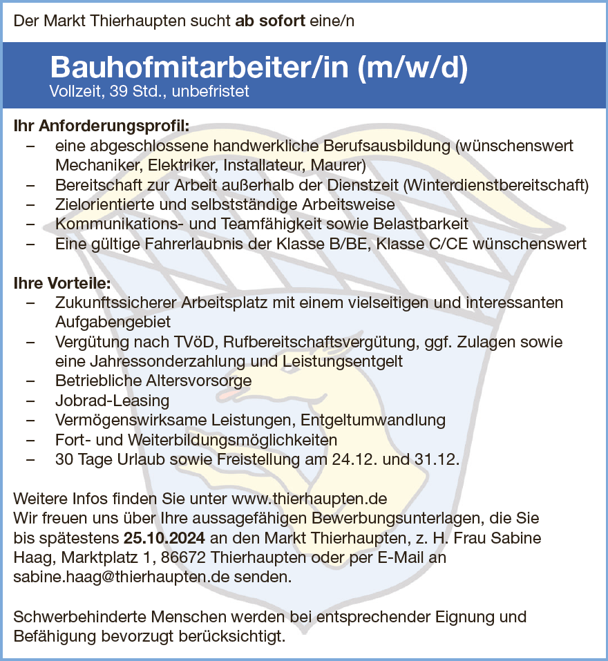 Sie sind hier: Startseite » News Heimatinfo » Der Markt Thierhaupten sucht ab sofort eine/n Bauhofmitarbeiter/in (m/w/d)