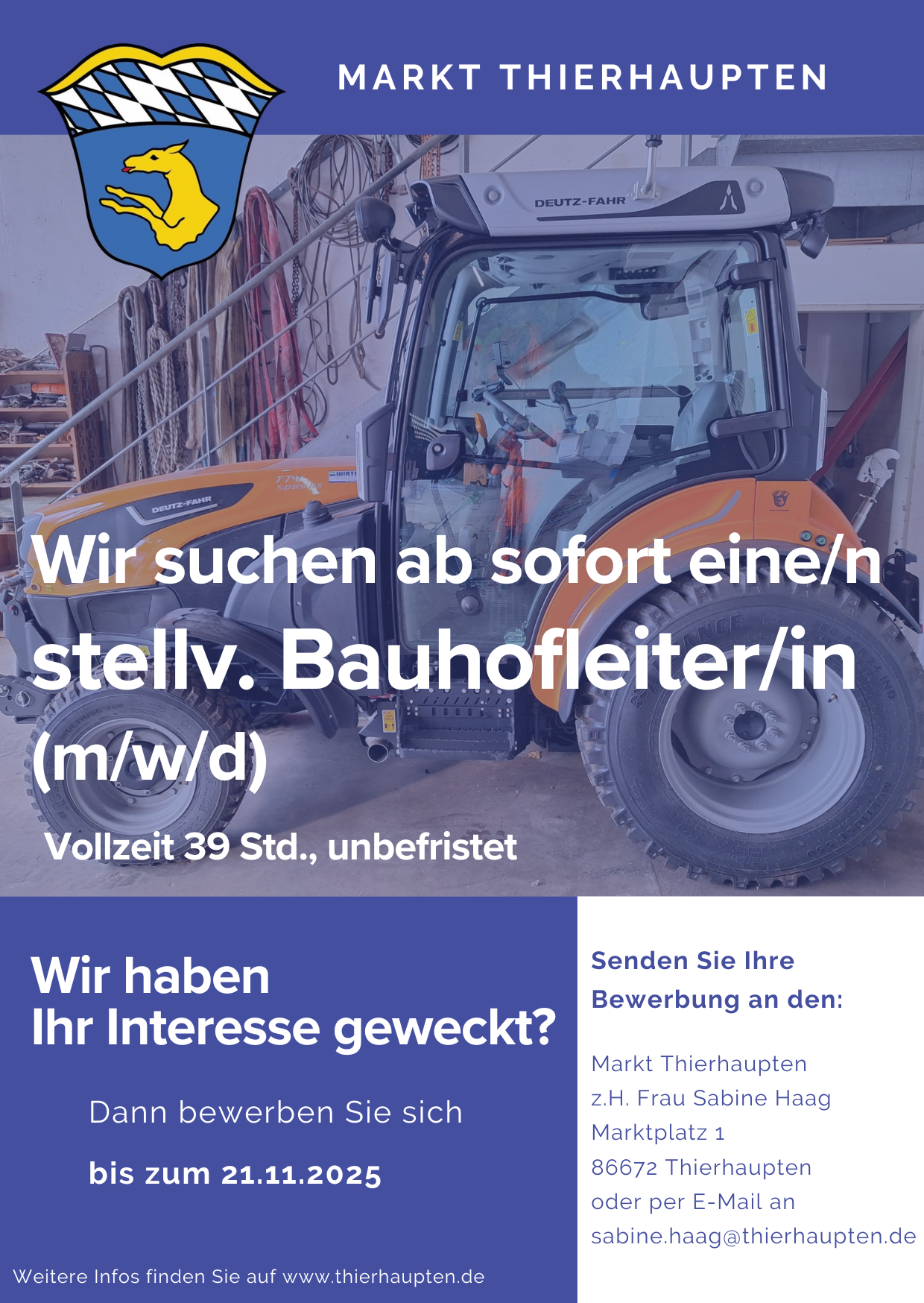 Sie sind hier: Startseite » News Heimatinfo » Der Markt Thierhaupten sucht ab sofort eine/n stellv. Bauhofleiter/in (m/w/d)