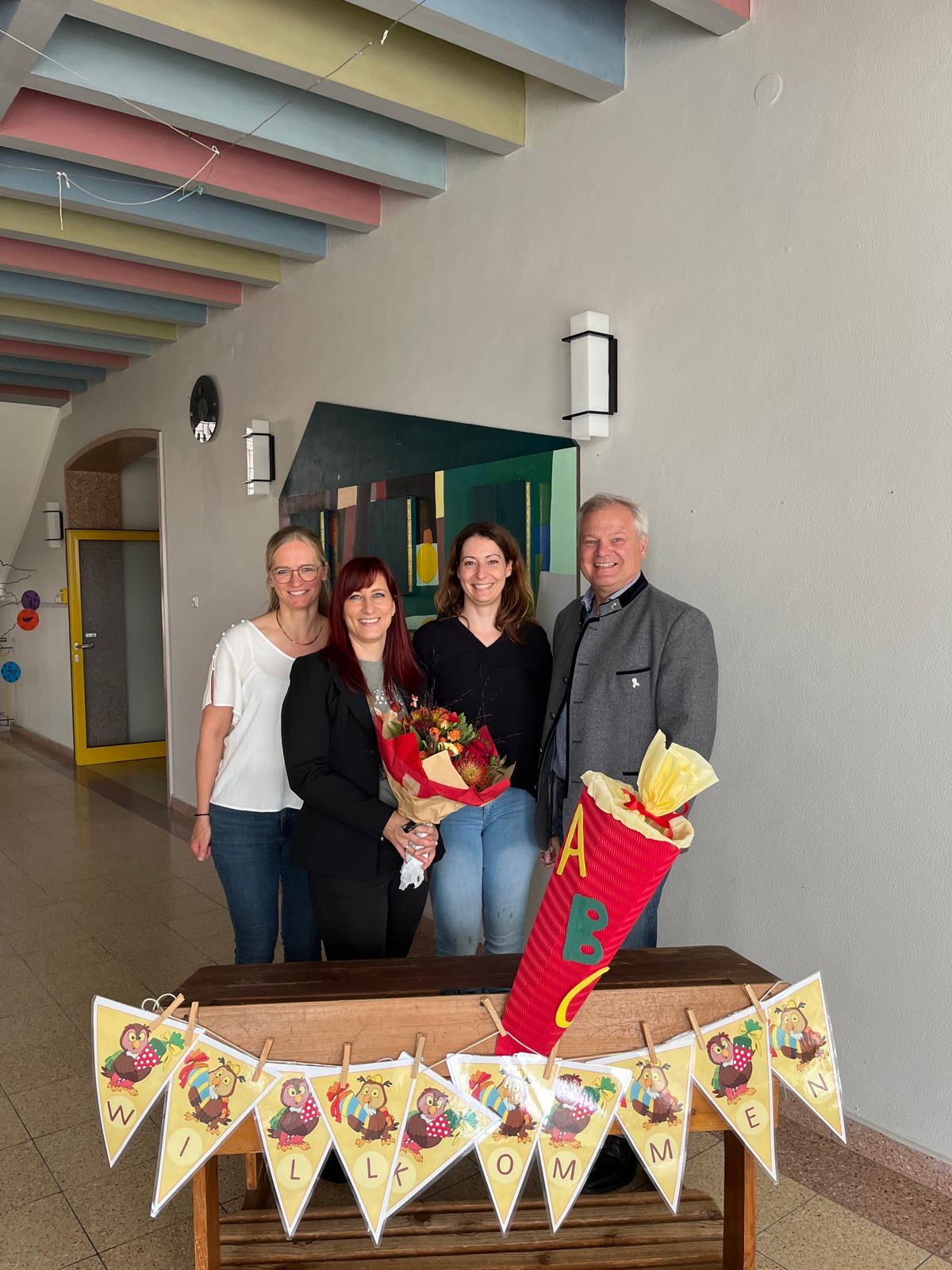 Frau Dübgen (Elternbeirat), Frau Margit Ludl (Schulleiterin), Frau Augustin (Elternbeirat), Erster Bürgermeister Toni Brugger